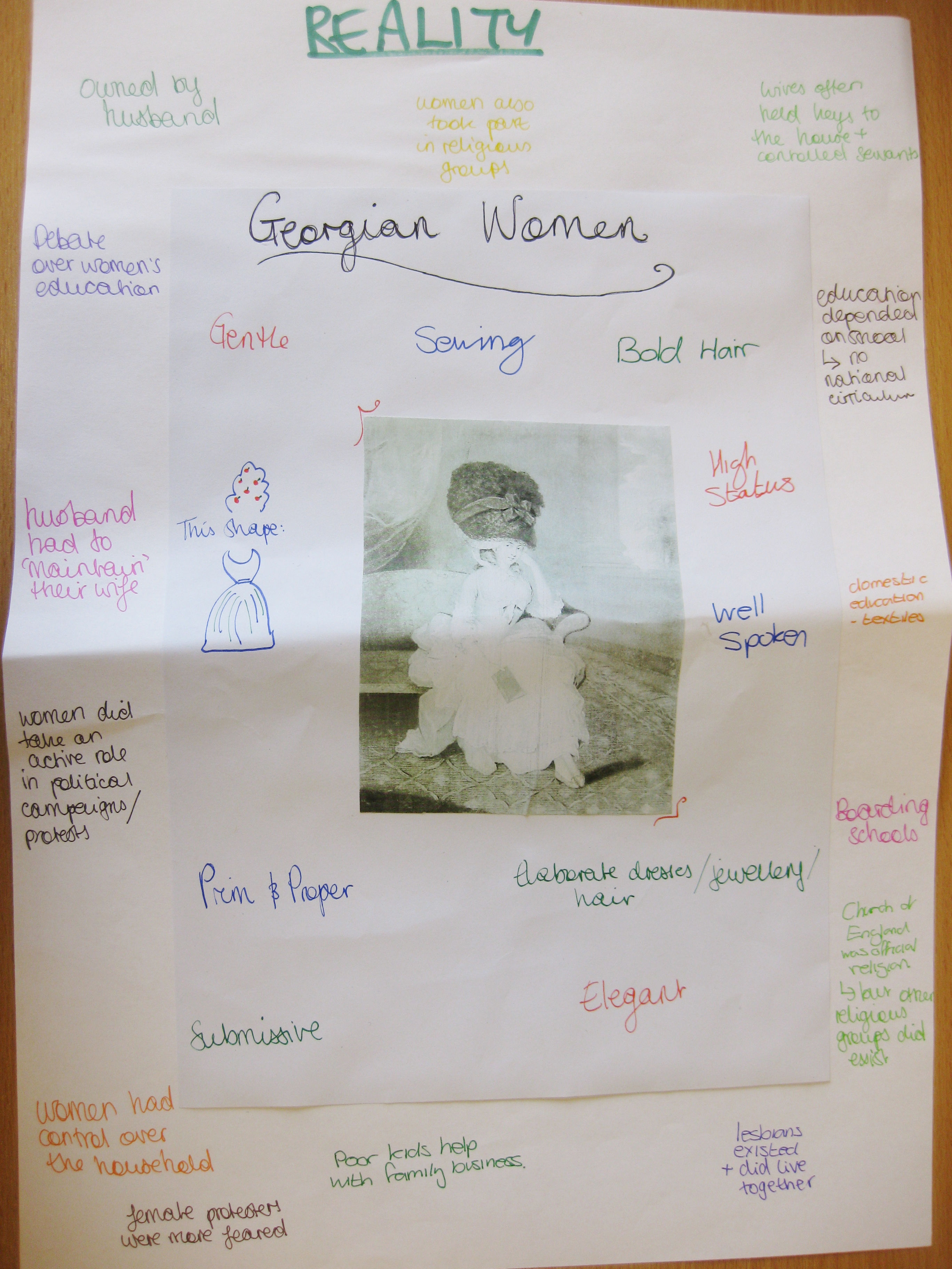 For our next activity we gave the students a quick quiz which contrasted the rights and status of British men and women. This task was designed to address the perception that the lives and experiences of most women and most men were fundamentally different. We wanted to highlight that, certainly in legal terms, most men were also excluded from the political and social spheres. For example, we asked the students to tell us when most men got the vote (1918) and when most women got the vote (1928) and when compulsory education was introduced for boys (1870) and for girls (1870). The students appeared to respond well to this, recognising that women and men are not homogenous groups and that when we talk about ‘important’ figures in history, we are usually talking about a group of very elite men.